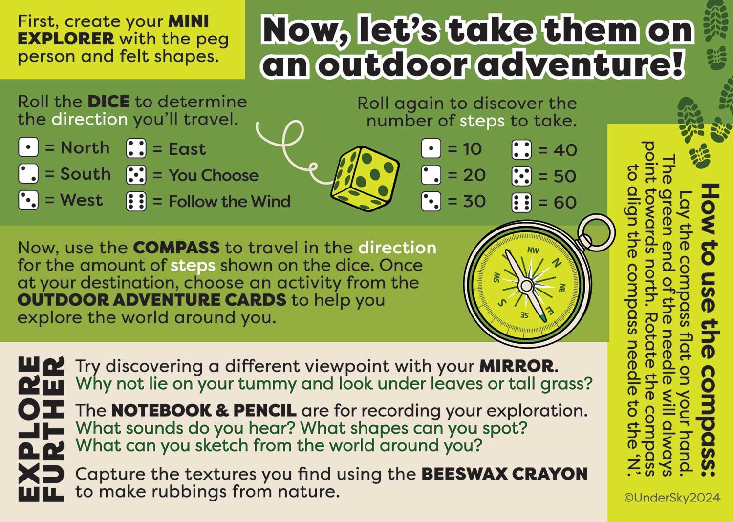 Once at your destination, choose an activity from the OUTDOOR VENTURE CARDS to help you explore the world around you. There are over 30 fun challenges to choose from including ways to use your senses and imagination, examine the details of nature or get practical and active outdoors.